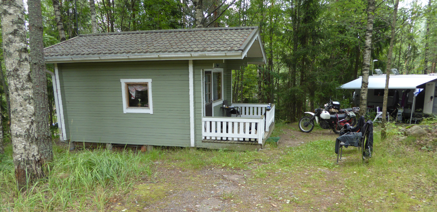 Bei dem Sauwetter hatten wir keine Lust auf rutschigen Schotter-Matsch und bewegten uns etwas lustlos Richtung Osten. Zwischendurch verließen wir die größere Straße, das führte aber nicht wirklich weiter. Schließlich sahen wir ein Hinweisschild auf einen Campingplatz mit gleichzeitigem Hotelangebot, und siehe da, es gab auch das "Sommerhaus", wo man in kleinen Zimmern mit Bett zu einem angemessenen Preis bleiben konnte. Gemacht.