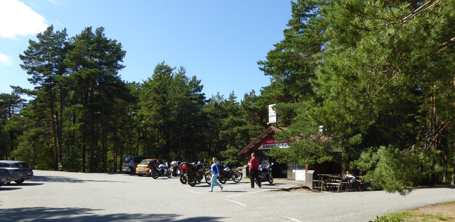 Dahinter liegt eine Insel namens Luononmaa (-maa bedeutet hier wie in Estland "-land"), die man über eine Hochbrücke erreicht. Dahinter liegt gleich rechts an einem großen Parkplatz auf dem Berg eine der besten Pommes-Hütten unserer Reise. Da gibt es natürlich einen Haufen Zweiradfahrer, die diese Gelegenheit zu einer Pause nutzen, wir natürlich auch, denn Antti hatte uns das schon erzählt.