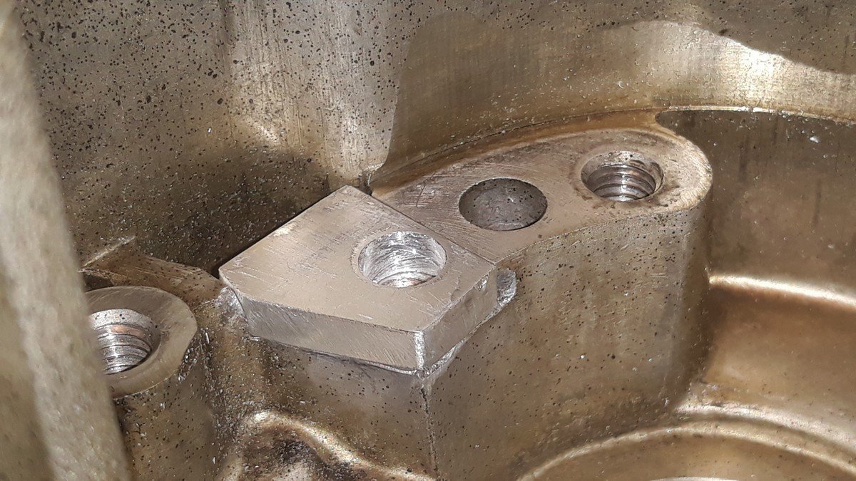 Dieses ist innen im Motorgehäuse mit drei Schrauben verschraubt. Als das Teil abgebrochen ist hat es die Auflagefläche im Motorgehäuse teilweise beschädigt. Die Auflagefläche im Gehäuse ist oberhalb der obersten Schraube nach hinten etwas weggedrückt.