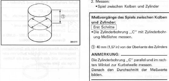 Nennmaß Zylinder = arithmetisches Mittel aus Durchmesser längs und quer in der Mitte vom Kolbenhub, also ca. 40 mm unterhalb der Oberkante Zylinder bei der XT/SR500: Zylinderbohrung C = (Längsmaß + Quermaß)/2