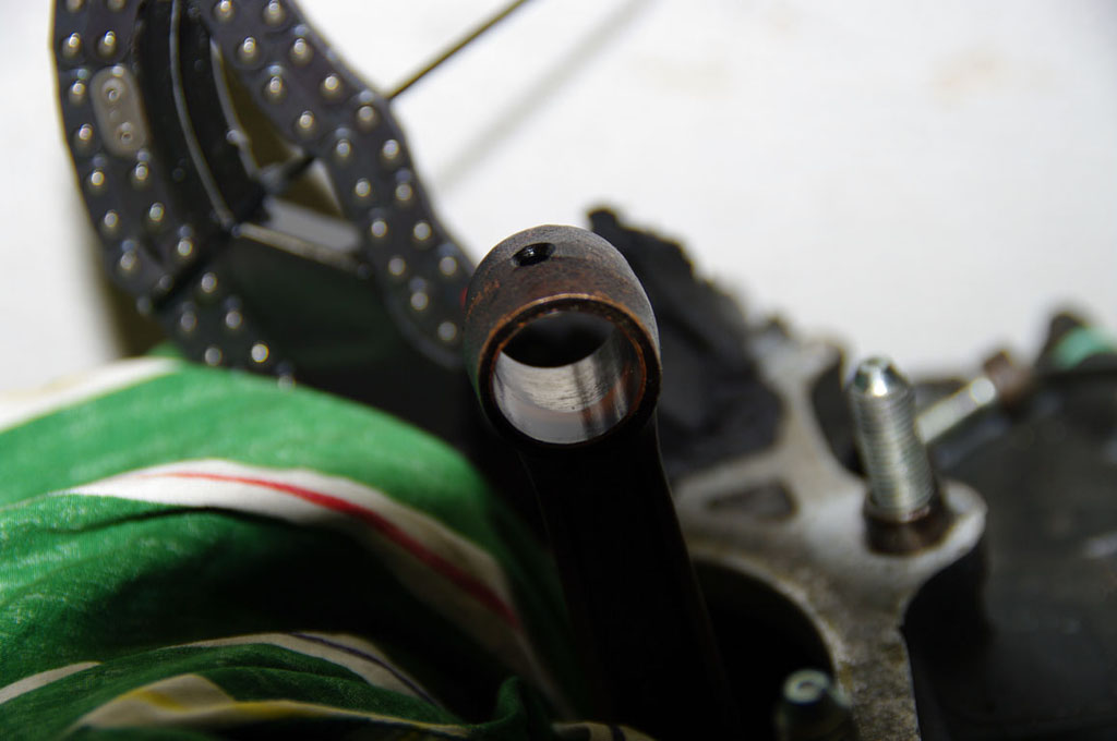 Wie gesagt, die Tour gut überstanden, aber mein Motor hat auch dieses mysteriöse Klopfen, das hier im Forum schon umfangreich beschrieben wurde. Es kommt ziemlich deutlich nicht aus dem Bereich der Ventiltriebe, sondern vom Zylinder, sprich Kolben. Habe jetzt im Herbst den Kopf abgebaut. Zylinder und Kolben sehen wie neu aus, was mich zwar freut, mich aber nicht wirklich weiterbringt. Allerdings sieht das obere Pleulauge nicht gut aus. Es ist einseitig eingelaufen (siehe Bild) und der Kolbenbolzen lässt sich ziemlich stark kippen (also Spiel nur auf der eingelaufene Seite). Kann es sein, das dieser kippende Bolzen den ganzen Kolben kippen läßt und damit dieses unschöne Geräusch erzeugt? Der Kolben lässt sich im Zylinder von hand relativ stark quer kippen. Das Pleul zu wechseln wäre dann doch ziemlich aufwändig.