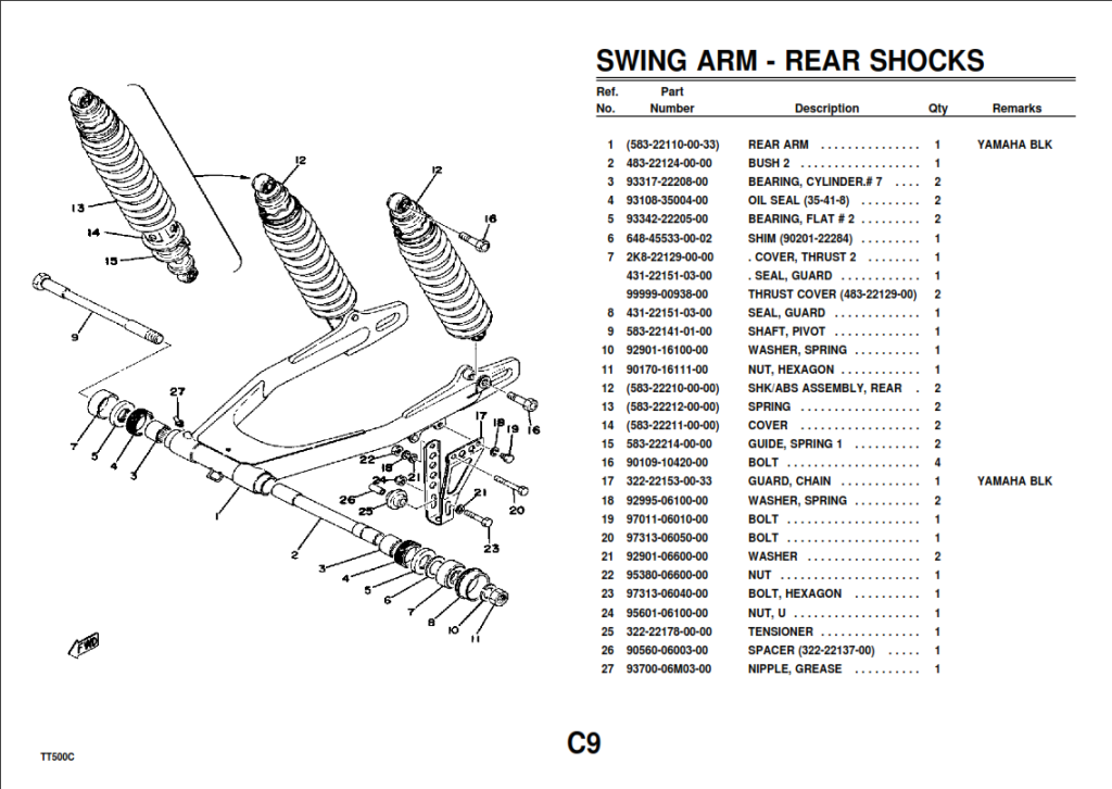 Ja, genauso wie oben geschrieben und auf dem von Dir eingestellten Microfiche abgebildet. Auf den Bildern ist übrigens die falsche Bremsankerstrebe montiert (zumindest wenn es sich um eine TT 500 Schwinge handelt). Gelochte Alustrebe wäre hier richtig.