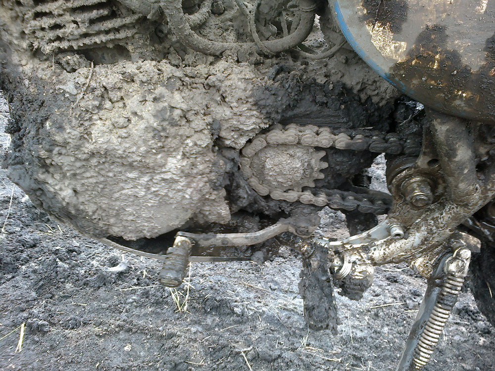 Durch den ständigen Regen ist die Strecke eine einzige Schlammschlacht. In meiner zweiten Runde rutscht in einer Schlammspur die Kette ab und zerfetzt meine Ritzelabdeckung. Alle drei Halterungen am Motor sind hin. Es kostet einige Mühe die Kette wieder aufzulegen, die hat sich verkeilt. Die Ritzelabdeckung werfe ich an den Streckenrand. Glücklicherweise ist der Motor nicht Leck geschlagen.