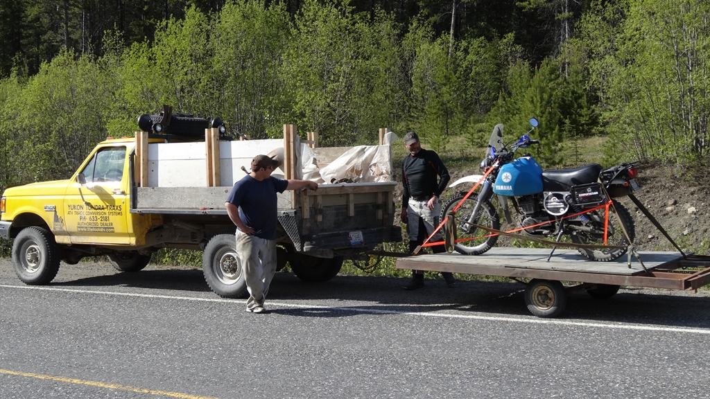 Ich fahre zurück nach Teslin, organisiere am Sonntagnachmittag einen Anhänger mit Fahrer und wir holen die XT und den unglücklichen, in der prallen Sonne wartenden Fahrer zurück zum letzten Outpost. Alles ohne Handyverbindung, ohne WLAN – funktioniert doch.