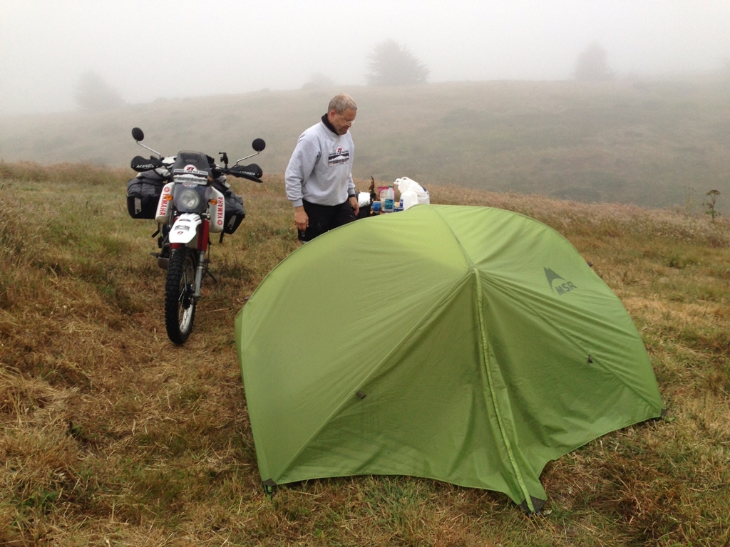 Am Vorabend sind wir nach einem kurzen Abendessen in stürmischer Dunkelheit in unsere auf einer Düne stehenden Zelte gekrochen. Irgendwann nach Mitternacht fällt mir schlaftrunken auf, dass der Sturm tatsächlich nachgelassen hat. Gut – Zelt steht auch fest verankert und morgen erwartet uns ein weiterer Ritt auf dem 1er entlang der Küste in’s südliche Kalifornien. Und dann gibt’s da natürlich noch die obligate Fahrt mit der XT500 über die Golden Gate Bridge in San Francisco. Mit dieser Gewissheit schlafe ich wieder ein. Gegen 06.00 Uhr fällt mir auf, dass das Zelt innen Kondenswasser hat. Erstaunlich bei der dem Wind ausgesetzten Lage. Also mal rausschauen… Nebel – so dicht, dass einem das Wasser gleich Tropfen an der Nase bildet. Eine sehr hohe Luftfeuchtigkeit – der Nebel entlang der Küste ist berüchtigt und böse Zungen behaupten, dass der tagelang liegen könne.