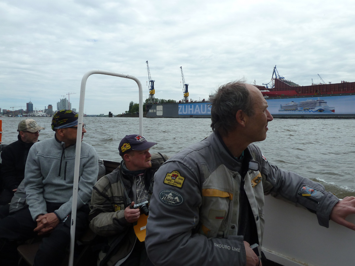 Im Sonnenuntergang gegen 21.00 Uhr startet dann eine kleine Gruppe von etwa 18 XTs zur Nachtausfahrt. Erster Stopp ist das Hafenmuseum, zweiter der Fähranleger gegenüber den Landungsbrücken.