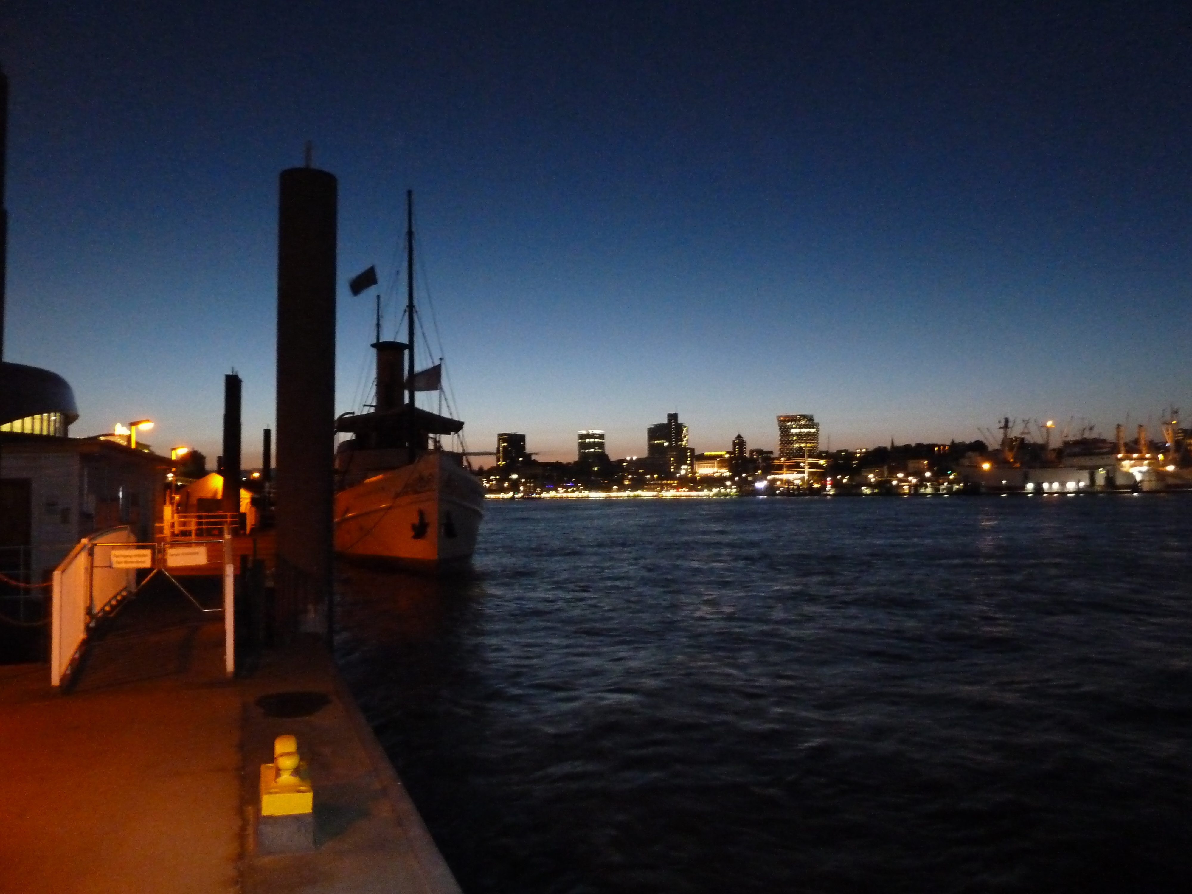 Im Sonnenuntergang gegen 21.00 Uhr startet dann eine kleine Gruppe von etwa 18 XTs zur Nachtausfahrt. Erster Stopp ist das Hafenmuseum, zweiter der Fähranleger gegenüber den Landungsbrücken.