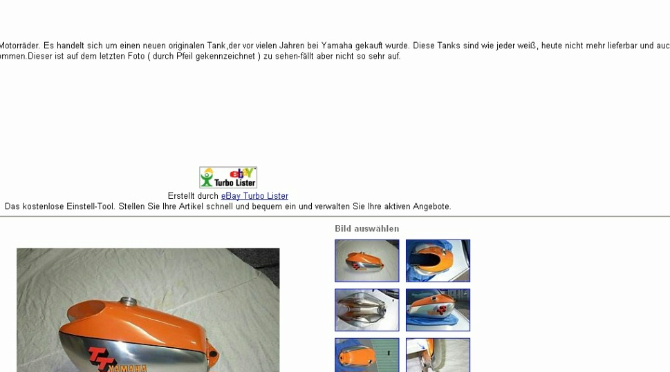 Habs mir auch überlegt ihn zu kaufen aber da ich auf meine E-mails keine Antworten bekommen habe war er mir dann doch zu suspekt.Wollte wissen ob der wirklich neu und noch original lackiert ist da er auf den Bildern doch Laienhaft lackiert aussieht .Zumindest sieht das Dekor etwas verutscht aus und wäre so sicher nicht durch die Endkontrolle bei Yamaha gekommen.Auch sieht die Unterseite ( unten im Tunnel ) zu stark lackiert aus da normalerweise die Tanks unten nur dünn eingenebelt wurden.Habe auch schon mehrere neue Yamaha Tanks gesehen aber noch keinen wo die Abdeckung vom Lackierer noch drauf war.Hoffe natürlich für den Käufer ,daß er einen wirklichen Top kauf gemacht hat.