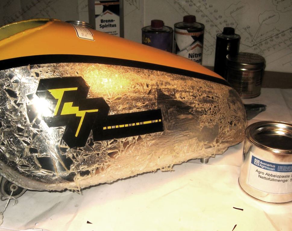 Tank und Schutzblech sind ja mit der 2K Farbe behandelt worden. Im Tunnel des Tank's, löst sich die Farbe sehr gut ab. Auf der oberen Seite musste ich den Klarlack und die Aufkleber mehrmals einstreichen und mit einer scharfen Klinge nachhelfen. Beim Schutzblech hat sich die Farbe schon nach 10Minuten komplett verabschiedet. Mit dem einen Liter habe ich bis jetzt einen Tank, ein heck Schutzblech und eine Schwinge sauber bekommen. Die auf gefangene Plärre ist zwar jetzt trüb aber immer noch aggressiv.