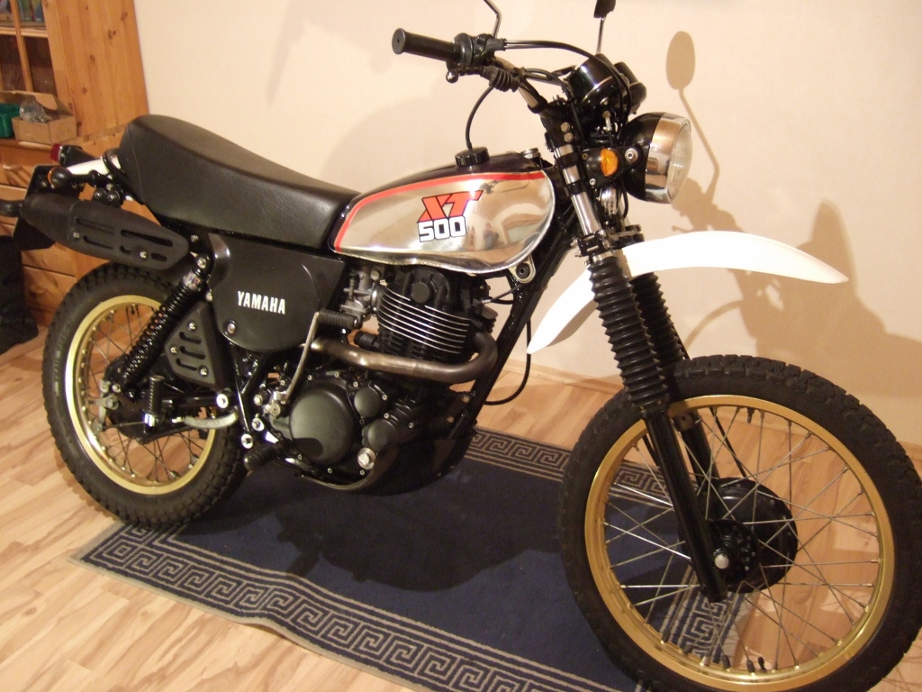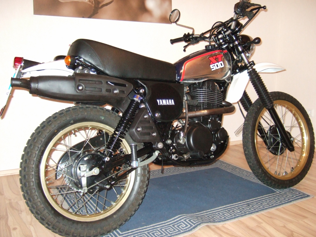 Jetzt sollte aber noch eine XT 500 her, irgendwie alte Erinnerungen. Hab dann im Sommer eine gefunden Bj. 80 mit 55tkm, recht guter Zustand. Bin dann über den Sommer einige Kilometer gefahren und wollte sie dann über Winter etwas aufhübschen. Ging jetzt aber schneller als gedacht, der Winter ist noch nicht mal da und das Moped ist fast fertig. Rahmen, Schwinge und alle Metallteile Kunstoffbeschichtet, hier und da ein paar neu Teile, wie Schwingen und Lenkkopflager. Einen originale Auspuff besorgt und restauriert. Na ja, und das übliche halt. Polieren, putzen, schrauben....... Ich finde ist ganz gut geworden, aber schaut selbst.