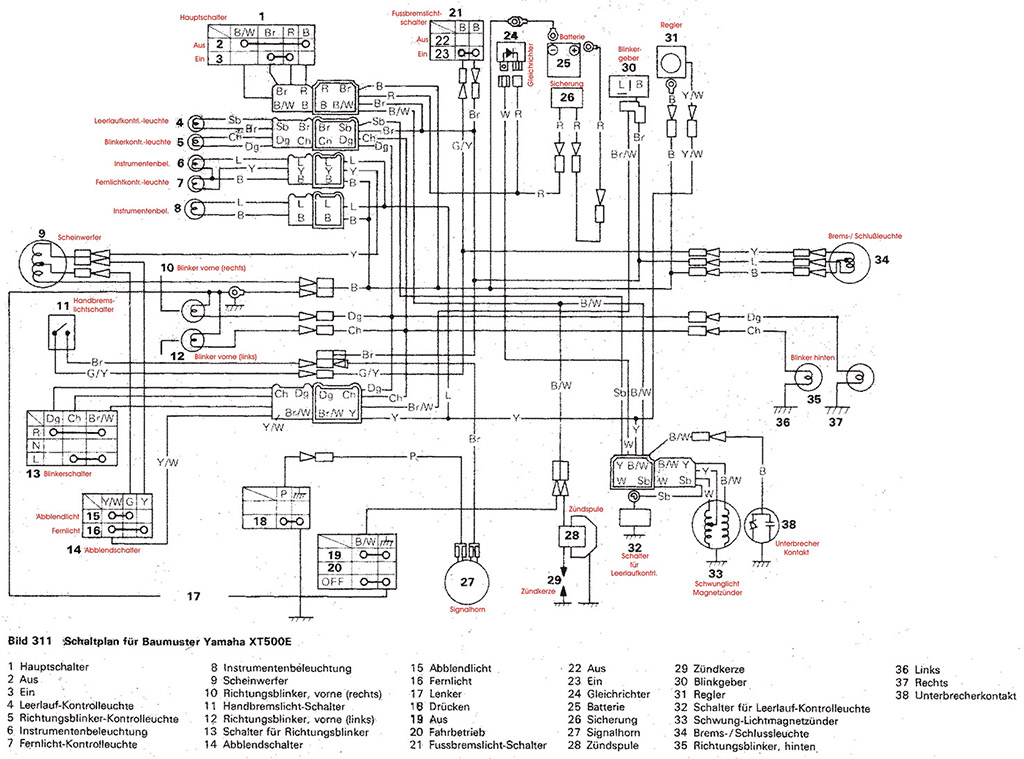 @XTfant: Der untere Schaltplan (XT500 E) steht so auch in der ersten Bucheli Ausgabe (XT500 Bj.1975-79) ist zwar mit deutschem Text, aber es ist der Schaltplan der US XT Bj.1978/79 (Lenkerschalter mit nur einem Anschlussstecker, Zündschloß auch und mit nur zwei Schalterstellungen (on/off).