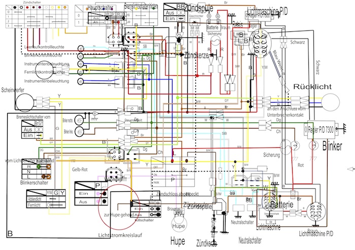 Die Steuerblock kann direkt am Rahmen im Bereich der Sitzbankbefestigungsmutter bleiben. Neuer Regler unterhalb des Rahmens links mit Moosgummi und Kabelbindern. Dann verbleiben ein rotes und ein braunes Kabel vom Regler, das braune an Masse, das Rote an Batterie-Plus. Massepunkte legen für Masse vom Reglergehäuse und für die Zündspule. Vom alten Regler (diesen entfernen) verbleibt nur noch der hellblaue(grüne) Kontakt zum Leerlaufschalter. Altes Kabel vom Regler zum Unterbrecherkontakt stillegen und gut isolieren. Alte Kontaktplatte und Fliehkraftversteller können drin bleiben. Scheinwerfer öffnen. Nun das hellbraune (nicht dunkelbraune!) Kabel welches vom Zündschloss kommt durchschneiden und die beiden Enden mit dem gelb-roten Kabel welches in den Kabelbaum Richtung Hinterrad geht verbinden. Dabei wird das gelb-rote Kabel gekappt und nur das Ende welches aus dem Kabelbaum rausschaut und nach „hinten, also Richtung Hinterrad“ weitergeht verbunden. Das andere Ende des gelb-roten Kabels wird isoliert. Verbindungen verlöten und mit Schrumpfschlauch versehen. Ich weiss es gibt bessere Möglichkeiten.