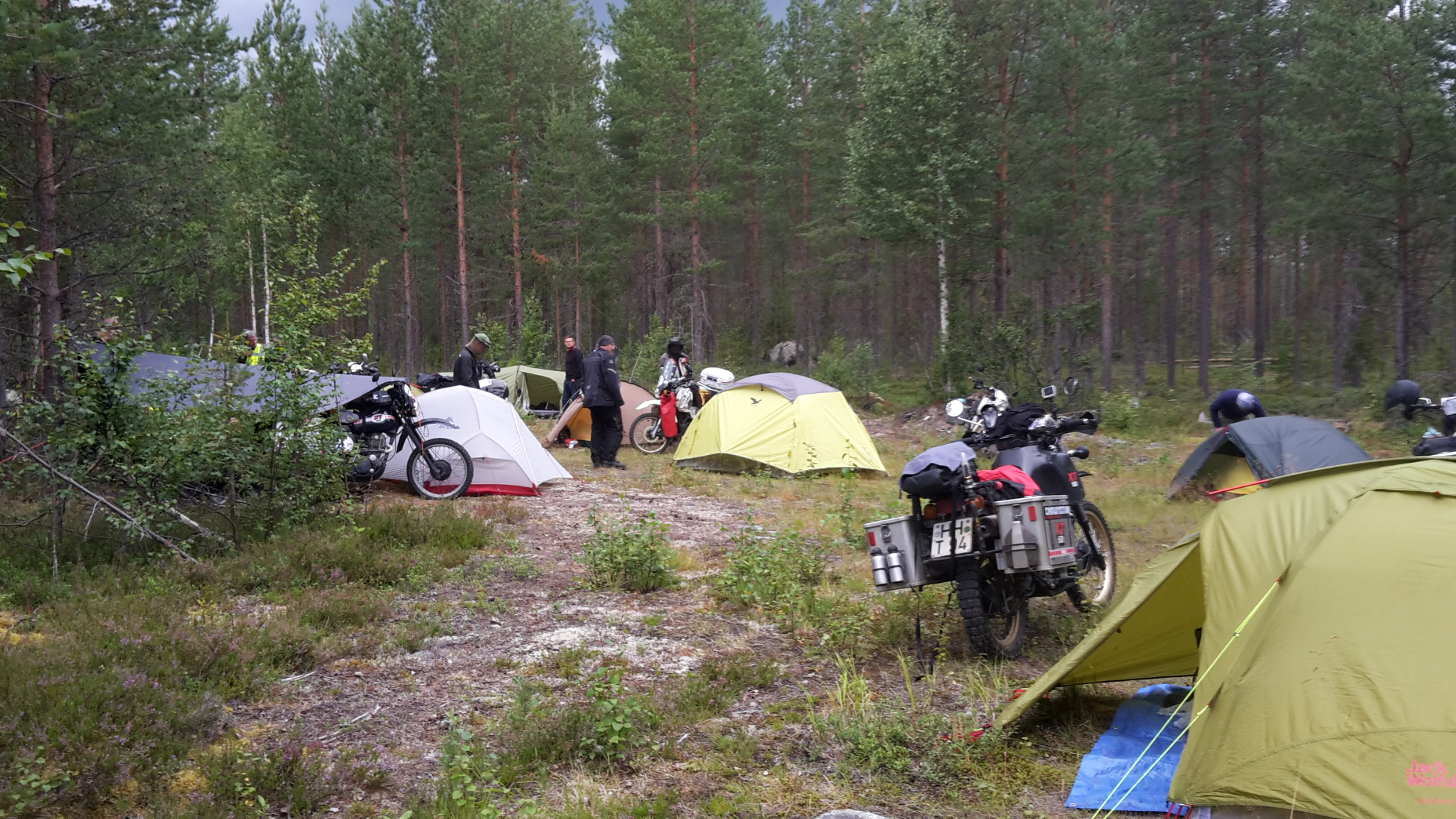 In der Nacht regnet es heftig, aber am Morgen haben wir Glück. Ab und zu schaut sogar die Sonne raus. Leons XT läuft schlecht, aber ablassen des Benzins aus der Schwimmerkammer löst das Problem. Irgendwie kommt da Wasser rein. Abwechsend über kleine Wege mit Schotteranteil und der E4 führt Martin uns schnell Richtung Lulea. An der Tankstelle in Skellelftea baut sich hinter uns eine Wolke auf, die sehr bedrohlich wirkt. Wir flüchten auf der E4. Bei unserer zweiten Pause sucht Martin einen Platz an der Ostsee. Der Weg dorthin ist sandig und Björn schlingert kopfüber in einen Graben. Aber nix passiert. In Töre kaufen wir um 1400 ein und machen eine weitere Pause an der Ostsee in Töre Hamn. 300km haben wir schon. Vor uns wieder so eine bedrohliche Wolke. Ausläufer erwischen uns, während die Sonne uns von der Seite anstrahlt. Wir finden einen Wildcampingplatz 3km von der Strasse entfernt. Die Zelte stehen heute schon um 1700. Gesamt 2.450km, Tages 385km.