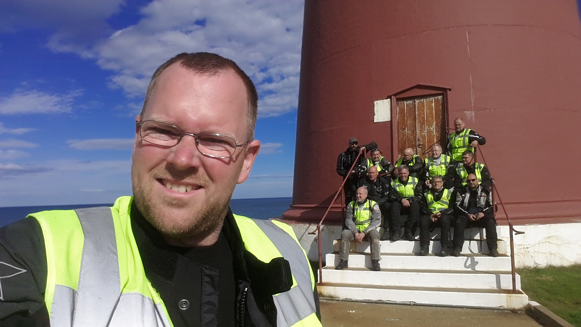 Da nur Michel und Klaus-Peter ihr Zelt abbauen müssen, klingeln die meisten Wecker erst 0630. Trotzdem sitzen wir 0800 auf den XTs und fahren die 120km nach Slettnes Fyr. Die Landschaft ist der Hammer. Keine Bäume, keine Büsche. Nur Steine, Moos, Flechten und Blaubeerkraut. Aber die Krönung ist das Wetter. Aufgelockerte Bewölkung und dann da oben Sonne. Slettnes Fyr - der nördlichste Leuchtturm auf dem Festland der Welt!!!! Und wir haben Sonne. Wieviele Menschen fahren tausende von Km zum Nordkapp und sehen nur Regen und Nebel. Das Leuchtturmcafé öffnet unszuliebe etwas früher. Die Kellnerin kommt aus Bremen und liefert uns neben Kaffee und heisser Schokolade auch Infos, Postkarten und eine Urkunde. Ausserdem verewigen wir uns natürlich im Gästebuch.