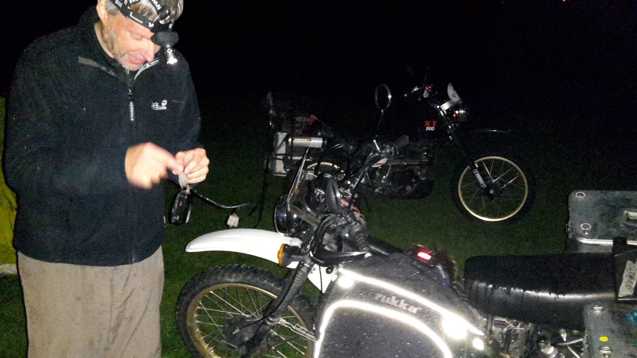 Ich glaube um 2245 erreichen wir Hagen mit dem letzten Tageslicht. Schnell Zelte aufbauen und Hagen schon die ersten Tipps zuwerfen. Um es kurz zu machen: der geschickte Fliehkraftregler ist falsch. XT Elektrik wird also nix. Wieder zurück auf SR Lima bauen. Während ich im Forum Fragen stelle und mit Hagens Papa telefoniere, kommt Michel selbst auf die Lösung. Lima in Cdi stecken und von Cdi orange und schwarz an die Zündspule. Aber ausprobieren können wir das um 0130 nicht mehr. Also ab in die Schlafsäcke. Gute Nacht!