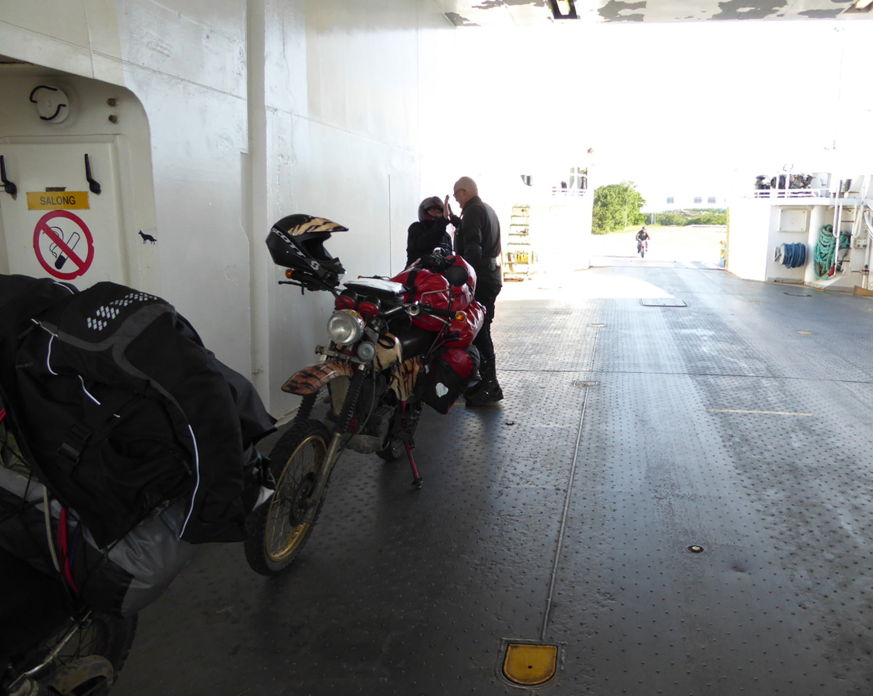 Wir klatschten ab, während die achselzuckenden Fährleute endlich die Klappe zumachten und ablegten. Auf Deck haben wir dann noch in holprigem Englisch ein bißchen geschnackt.