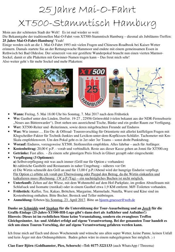 Hier sind die Infos für den Rahmen/Zeit/Ort für Mai-O-Fahrt des XT500-Stammtisches Hamburg. Diemal als Jubiläums-Treffen: 25 Jahre Mai-O-Fahrt! :dance