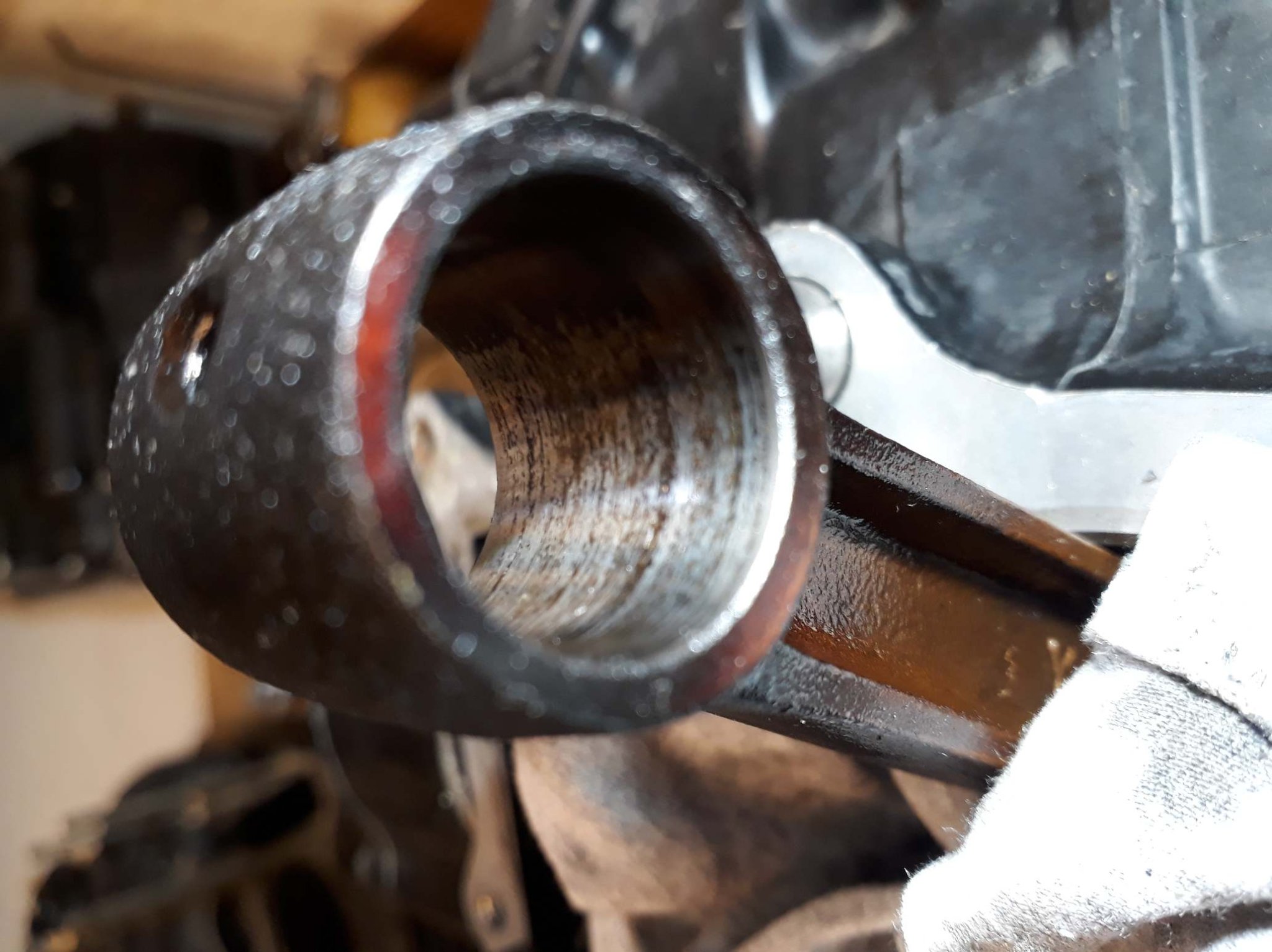Tja, und die zu Tage geförderten Fakten waren zwar nicht nur erbaulich, aber eben so wie sie waren...das Gute: der Motor war jungfräulich, noch auf 87 mm. :ja: Das weniger Gute: nicht nur der Kolben hat geklappert, sondern auch das obere Pleuellager ist über den Jordan.... :?