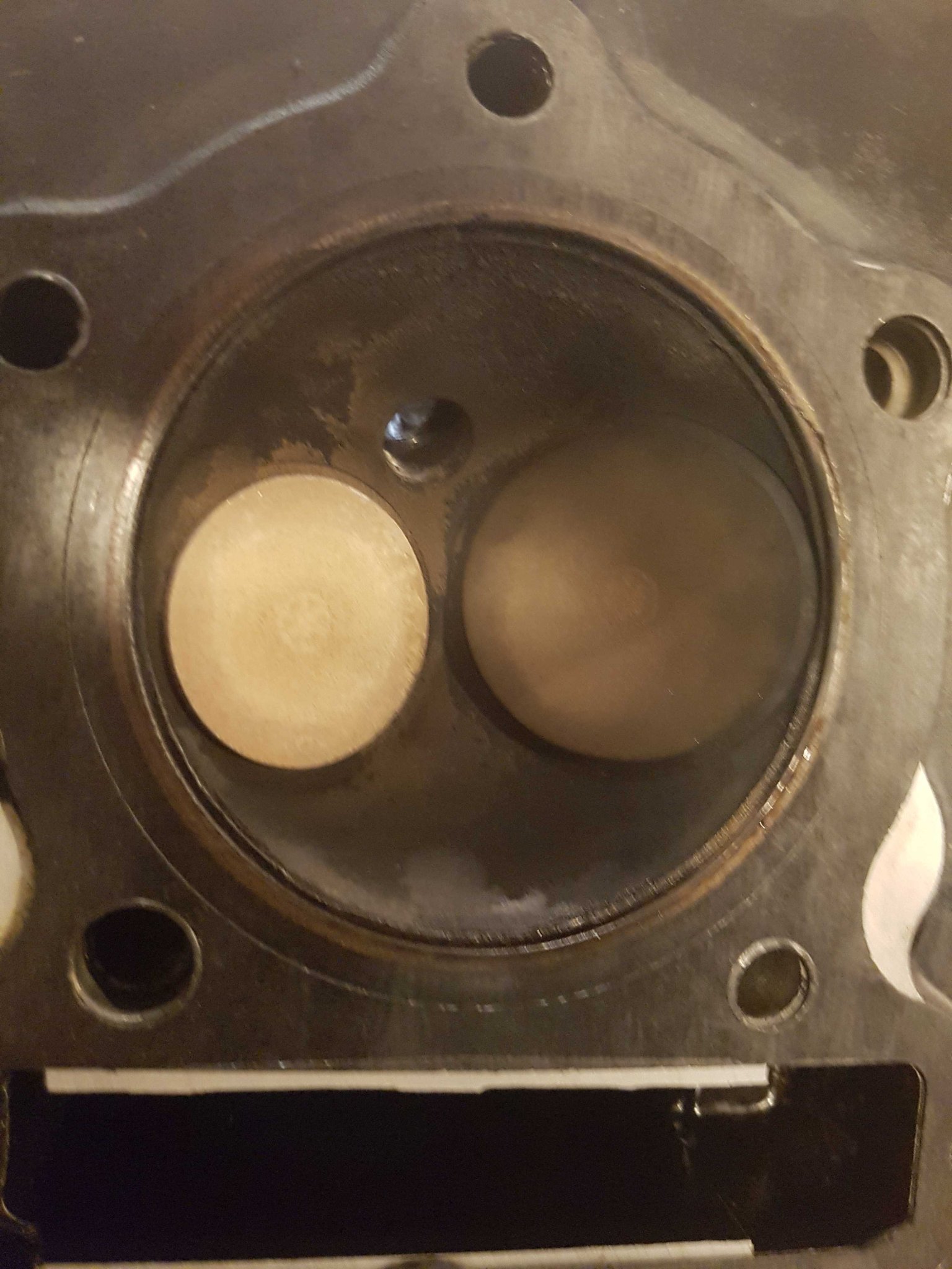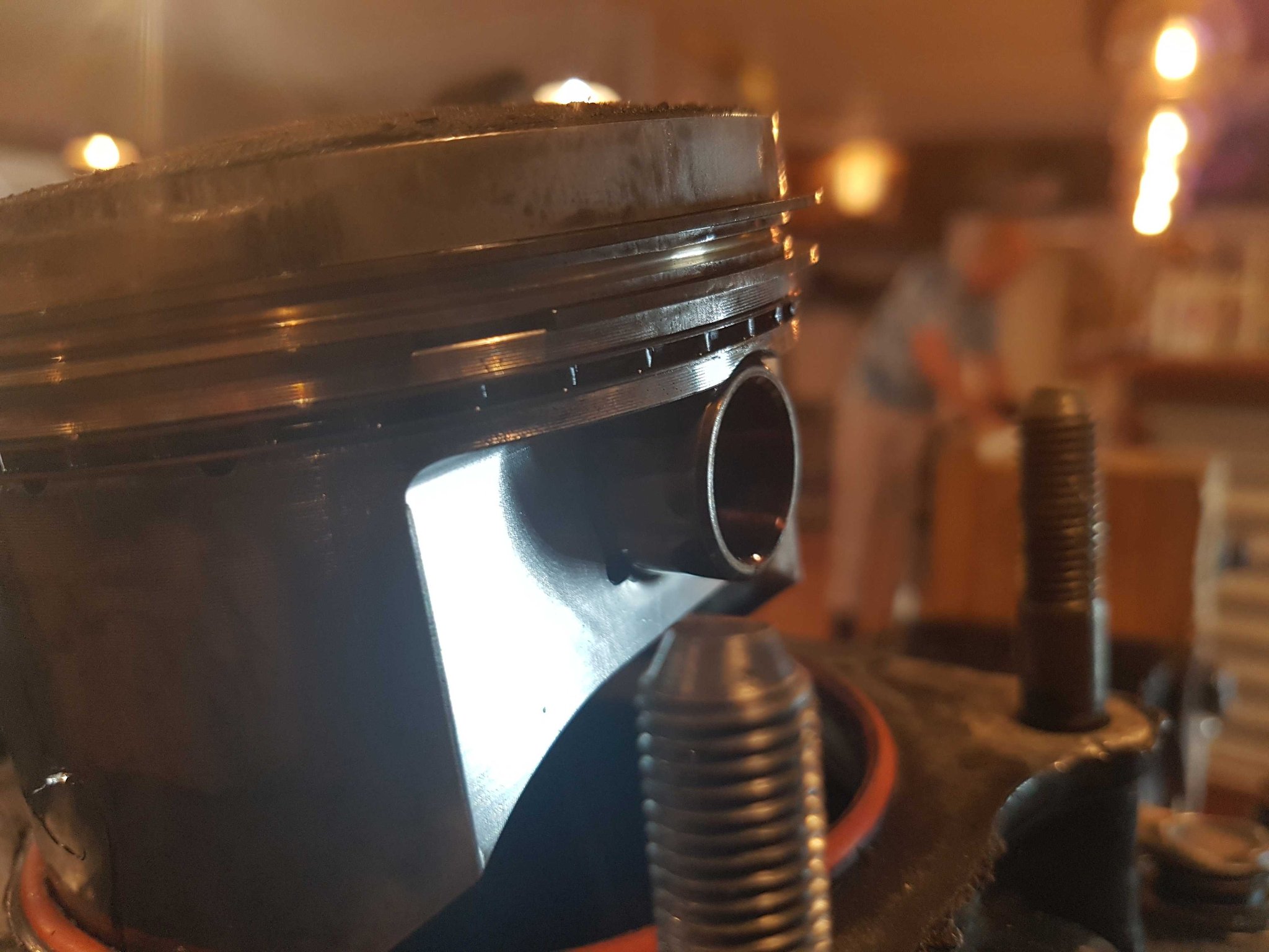 Nachdem der Zylinder runter war gabs dann was zu sehen: Der Kobenbolzen war auf der einen Seite rausgewandert bis auf Höhe Kolbenwand!? Bilder unten anbei. Der Bolzen lief nur noch auf einer Seite in der Kolbenbohrung und hatte denmnach satt Spiel. Ich würde sagen er kann gut einen mm gedreht werden, so dass damit der versetzte Einschlag des Ventils oben im Kolben vermutlich erklärt werden kann.