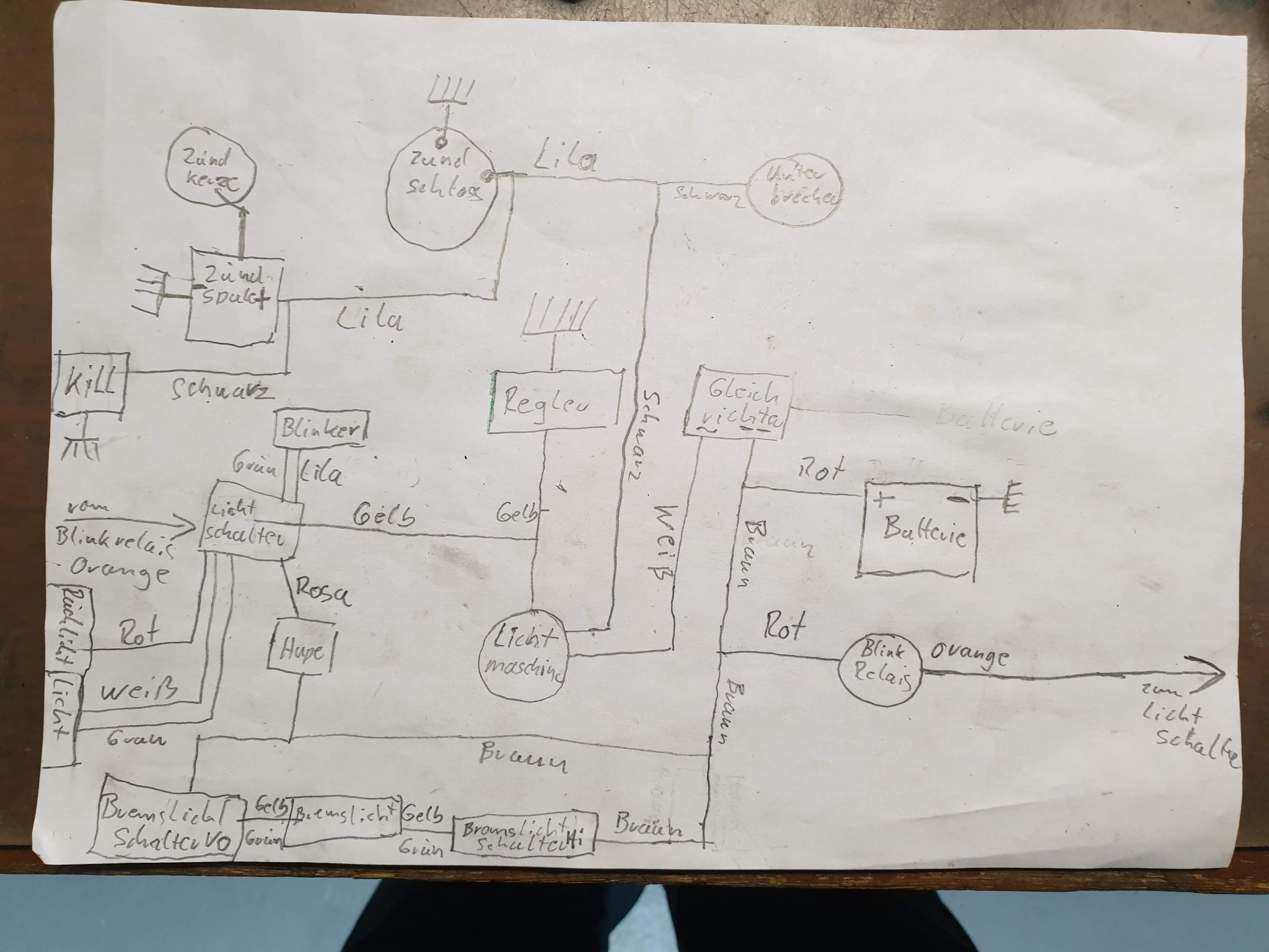 So ich bin jetzt fertig mit meiner kompletten Neuverkabelung, denn das war es letztendlich, obwohl das vorher so schlecht gar nicht aussah. Ich habe versucht das vereinfacht zu dokumentieren, weil Leute wie mich so ein richtiger gezeichneter Schaltplan eher abschreckt, weil zu komplex. Ich habe jetzt den Röbi Regler integriert und evtl. ist es auchfür andere Elektrik Laien so etwas einfacher zu verstehen. Die Kabelfarben sind so wie sie bei mir sind und haben letztendlich nicht mehr viel mit dem Original zu tun. Es scheint alles zu funktionieren, allerdings mein elektronischer Koso Tacho scheint die Elektrik nicht so zu mögen. Das Neutral Licht Geht schon ohne laufenden Motor immer aus und an . Verstehe ich nicht, ist ja letztendlich nur Zündungsplus über den Neutralschalter auf Masse gelegt. Wenn der Motor läuft scheint das Neutral stabil zu leuchten, aber Fernlicht Anzeige geht immer aus und an. Die Lichter selbst Fernlicht, Bremslicht, Blinker etc. funktionieren. Jemand ne Idee?