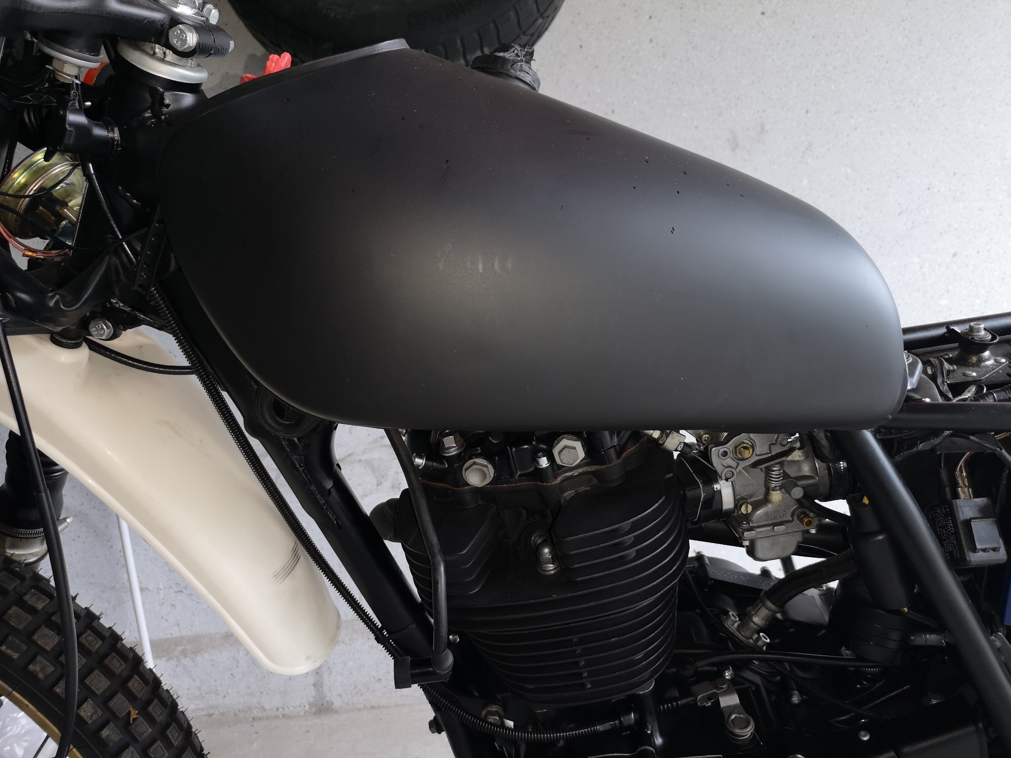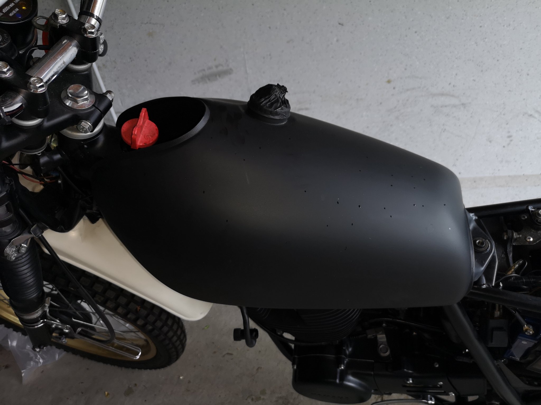 Der Tank passt nicht. Ich weiß zwar, dass es Probleme gibt, einen Tank vor Bj. 80 an eine XT ab Bj. 80 zu bauen (oder umgekehrt), aber das betrifft, soweit ich weiß, nur die Problematik mit den Gabelholmen, die bei starkem Lenkeinschlag am Tank angehen.