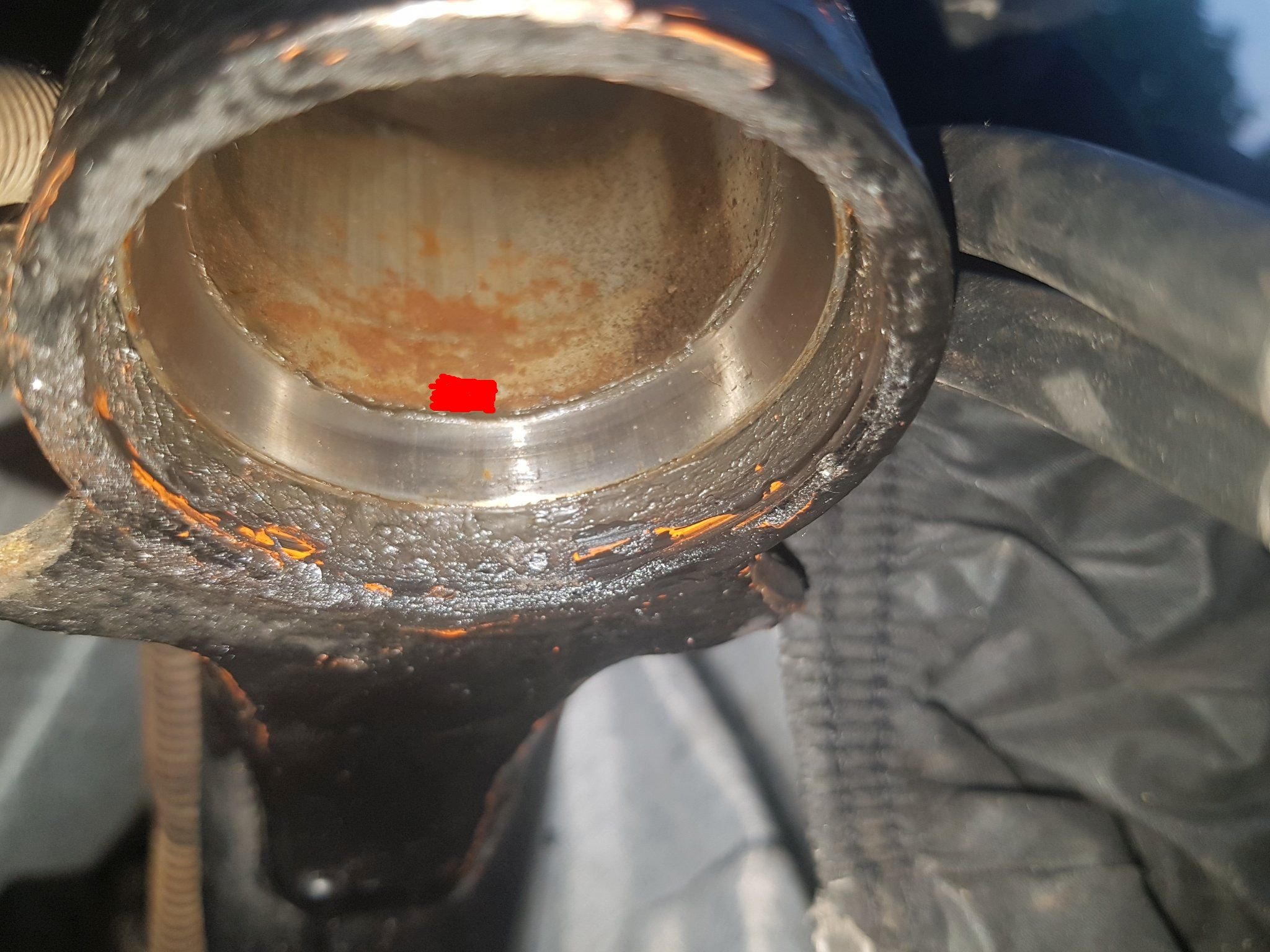 Heute gab es allerdings eine böse Überraschung. Der Rahmen ist zwar äußerlich schon angerostet, macht aber eigentlich einen sehr soliden Eindruck. Ich wollte heute dann den Öltank mit Tankentroster behandeln. Öffnungen abgedichtet, gefüllt bis an den Rand und gewundert warum es plötzlich eine Pfütze auf dem Boden gab. Zwei undichte Stellen, einmal oben am Rohr und unten am Bogen (siehe Bilder) Bin ehrlich gesagt unschlüssig was ich machen soll. Das kann man sicher gut schweissen (ich leider nicht), aber ist dann in ein paar Monaten eine andere Stelle dran und das ganze Öl liegt auf dem Boden? Muss mal mit dem Endoskop rein, aber ob ich da wirklich etwas sehe? ich befürchte der gehört aufs Altmetall, obwohl zum Beispiel die Fussrastenaufnahmen echt noch gut wären.