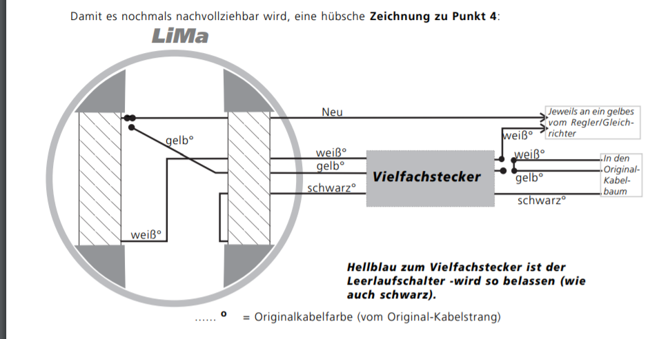 Sorry aber den Satz verstehe ich nicht so ganz. Wenn ich mir den Wunderlich Aufbau anschaue, dann wird doch nur das gelbe Kabel ersetzt durch "Neu" ersetzt. Dann werden "Neu" und Weiss aber Parallel mit dem Gelben vom Regler verbunden. Warum das gelbe Kabel ersetzt wird erschliesst sich mir nicht. Man hätte das ja auch direkt ab dem Stecker weiter zum Regler führen können....Du musst die beiden Spulen in Reihe schalten und den Mittelabgriff von der Masse nehmen.