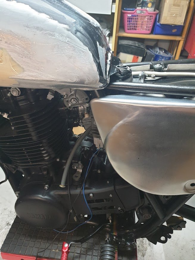 möchte an meinen Umbau zwei Alu Seitendeckel, die natürlich auch noch schon lackiert werden montieren. Der Linke lässt sich problemlos montieren, beim Rechten muss ich den Tank anheben sonst streift er am Tank beim montieren, was dann später weder für Tank noch für Seitendeckel optimal ist.