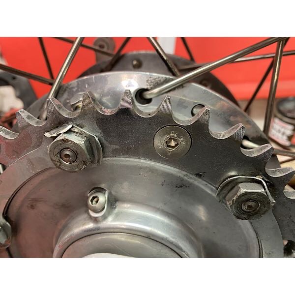 Die Original Muttern , Sicherungsbleche und Stehbolzen kommen dann weg, das Kettenblatt bekommt da Senklöscher und dafür kommen dann 8er Senkschrauben Torx eingeklebt ! ! ! ! ! ! !