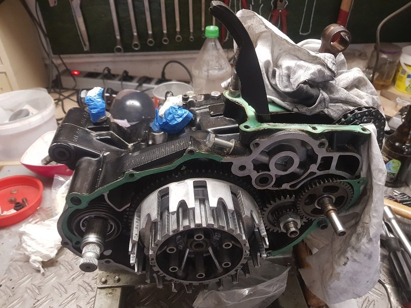 Nun geht die Öffnung des Motors los. Ich hab gestern angefangen den Kopf und Zylinder abgenommen und den Motor grob vom Schmutzbefreit. Mir ist damals schon aufgefallen das komischerweise der Ventildeckel vollständig lackiert war und der Kopf vom Lack befreit war. Es gab eine "selfmade" Schlagzahl im Ventildeckel und keine im Zylinderkopf (der hat BJ vor 78 mit schmalen Rippen).