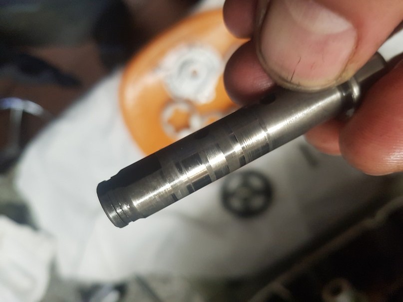 Anbei noch ein Bild vom Kolbenbolzen. Mit leichten Anlaufspruren. Wisst ihr ob das normal ist? - Sieht jetzt erst einmal unauffällig aus. Der Kolbenboden sieht innen völlig normal aus