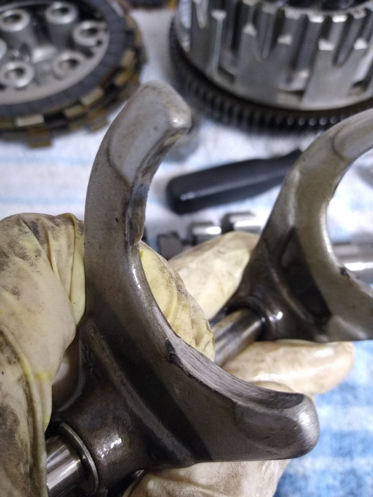 Ausserdem hast Du Glück: Das Angefressene sind NICHT die Laufflächen der Schaltgabeln. Diese laufen im Normalbetrieb nur beim Schalten, und da auch nur seitlich an, und an den Stellen sind sie -soweit ich das erkennen kann- noch einwandfrei.