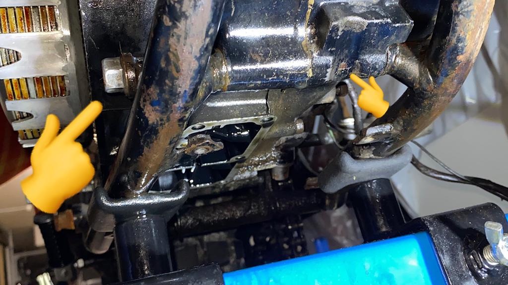 die Motorbefestigungsschraube unten ist genau so durchgesteckt wie die anderen auch. Mit abgeschraubter Mutter sollte sie sich drehen lassen. Sonst probier es mal mit richtigem Rostlöser, Wärme und wechselnden Drehversuchen.