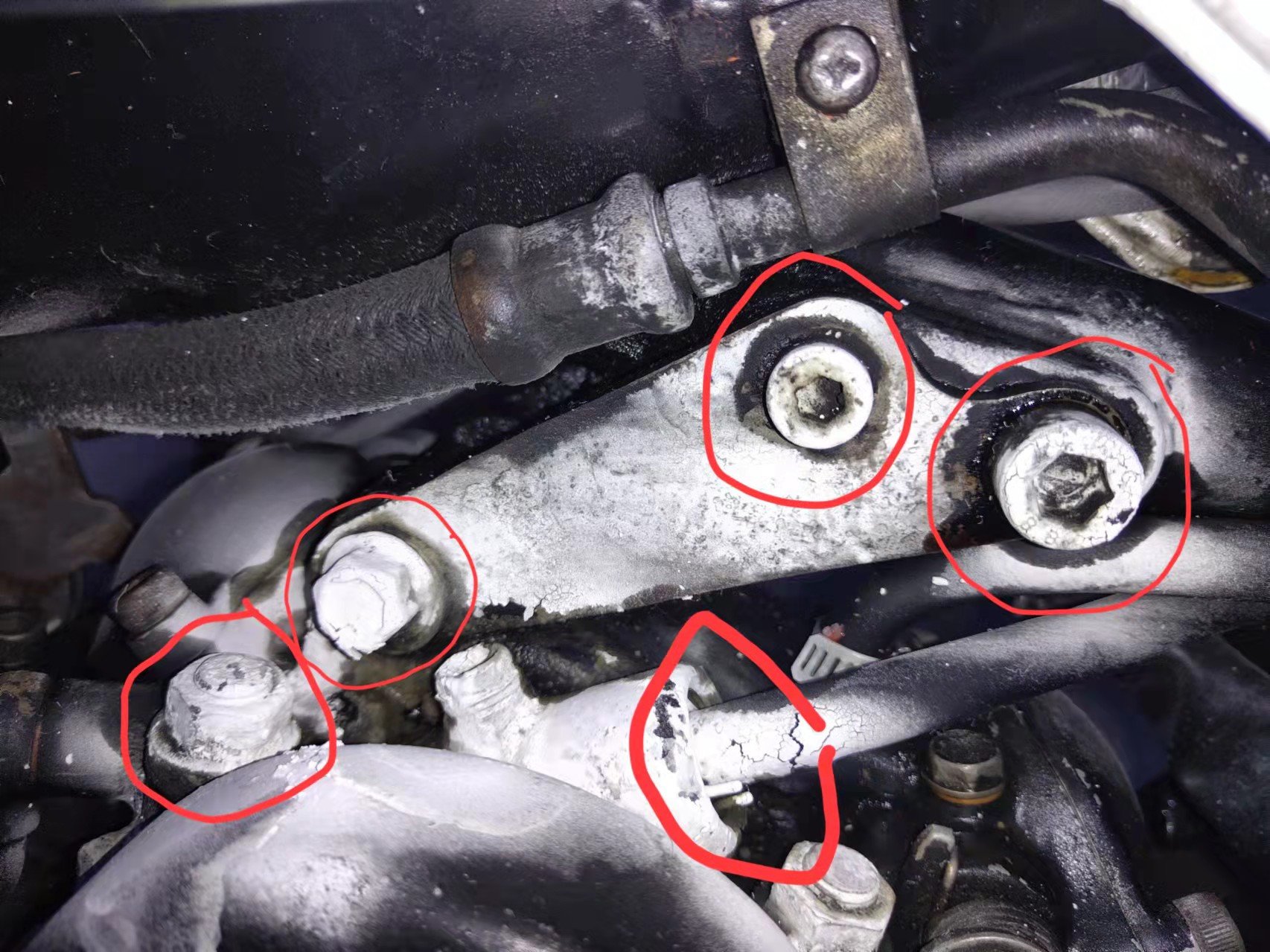 Das kleine Rahmenzwischenrohr ist ölführend. Auf dem Bild erkennt man, dass wohl mal Schrauben mit Innensechskant, die original verwendeten Flanschschrauben mit Sechskant verdrängt haben. Evtl wurde auch das Gewinde nachgeschnitten/gebohrt....und so eine kleine "Ölquelle" geschaffen.