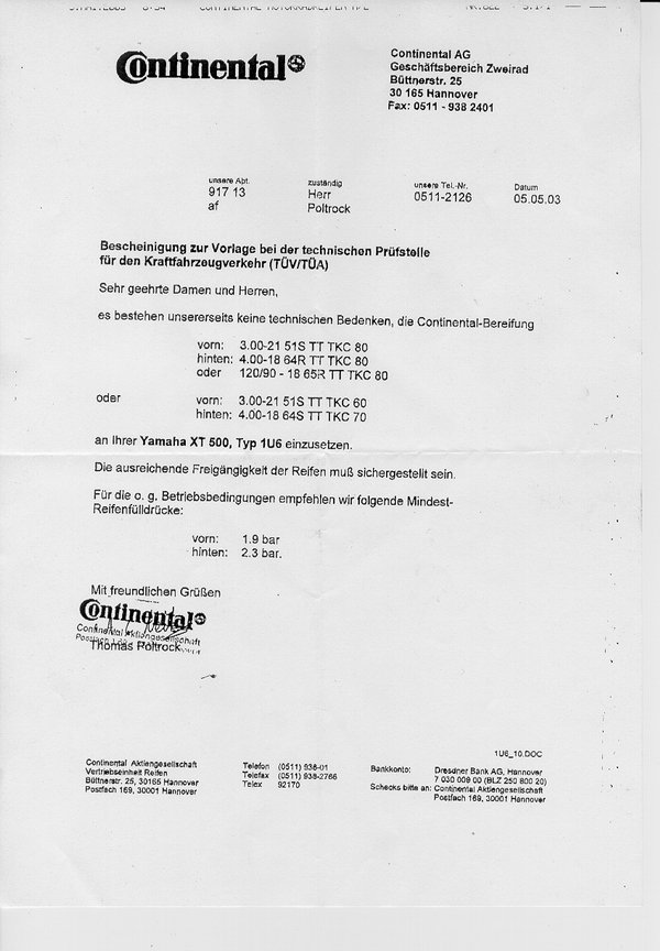 Jetzt bin ich aber irritiert, weil mir ein XT-Kollege hier aus Aachen gezeigt hat, dass man sehr wohl noch den vorgeschriebenen 3.25-21 Reifen bekommen kann (u.a. von Kenda, sehr günstig).