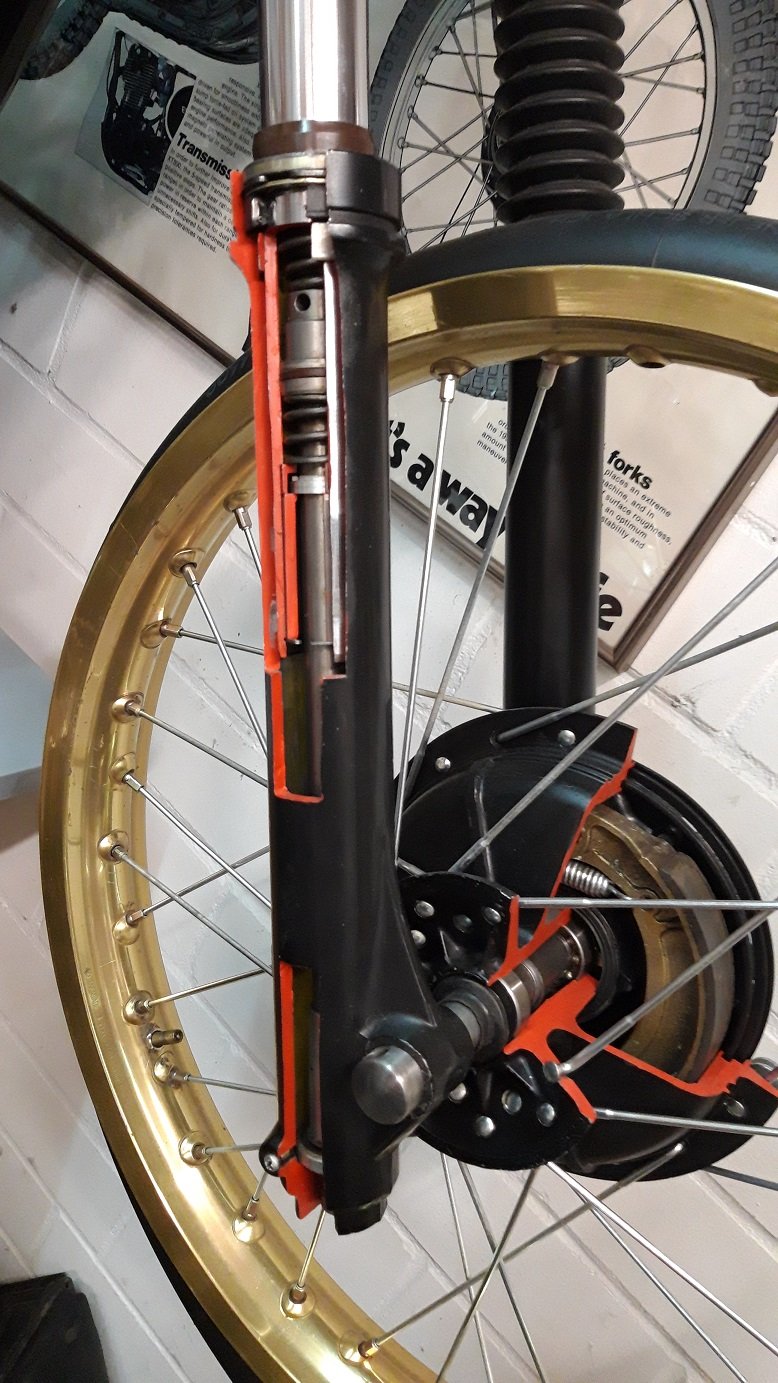 Die 2. Gabel ist genau so aufgebaut, hat aber eine etwas höhere, braune Staubkappe und darüber einen Metalring.