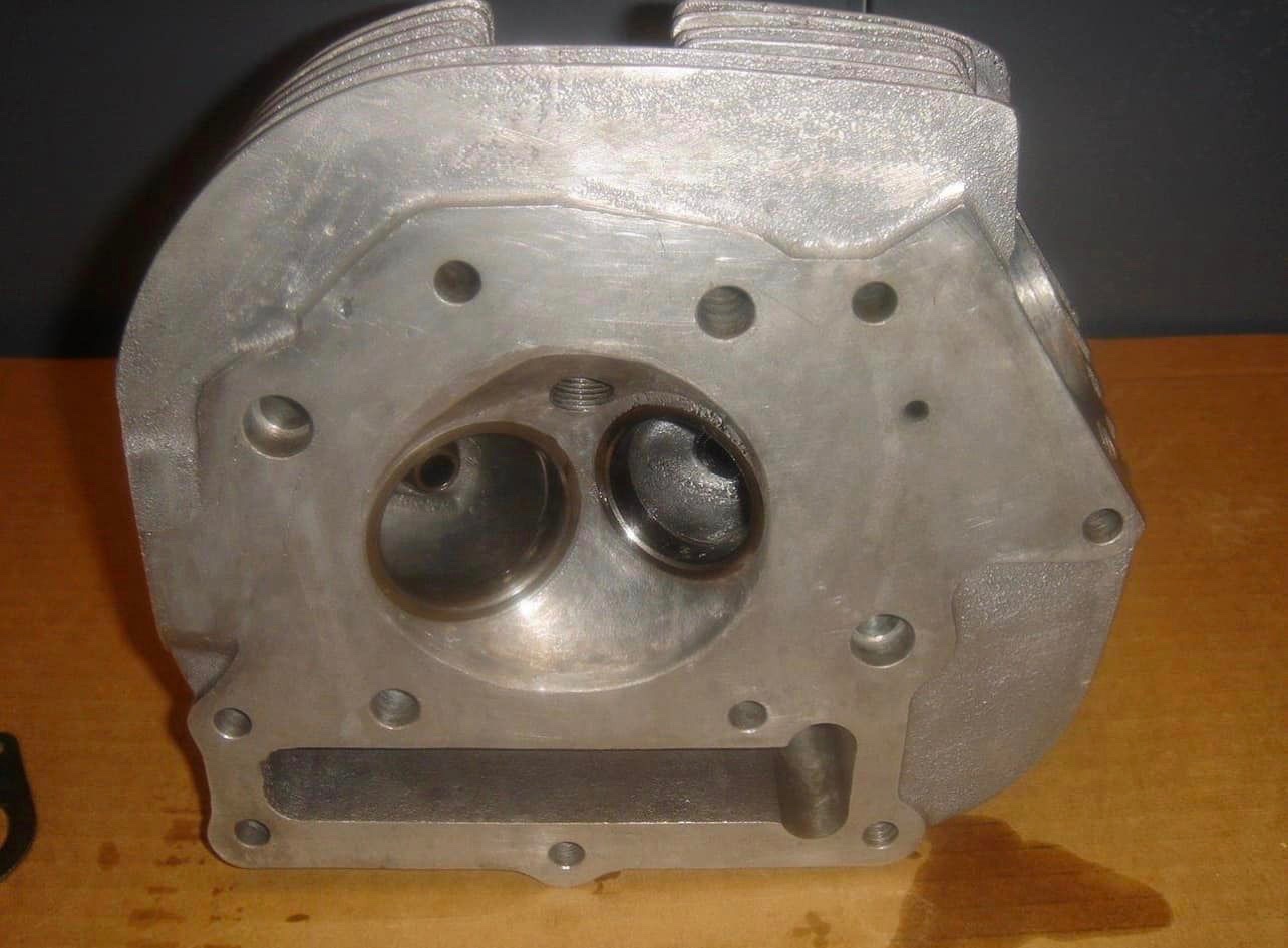"43mm intake and 37mm exhaust valves. Small hole at 2 o’clock is bleed hole for the kickstart activated automatic decompression system. Cylinder pressure is bled directly from a 2mm hole in the bore the hole in the cylinder head to bleed out the exhaust port to the exhaust pipe"