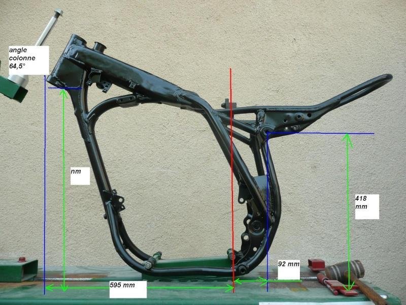 Kann man leider nur schwerlich genauer erkennen, aber es sieht so aus als wenn der gesamte Lenkkopf kürzer ist, das halbes Rahmendreieck fehlt, Stoßdämpferaufnahmen sind weiter oben/vorn mit ellenlangen Stoßdämpfern und ab Rahmenöltank oben alles Eigenbau, aber die Schwingenachse im Rahmen scheint unverändert (Achse ist auf Höhe der Rahmenspitze).