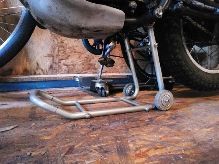 Die U-Bügel greifen die Rahmenstrebe unterm Motor, beim Treten auf den vorderen Bügel rollt der Bügel leicht über die Rollen und liegt dann flach auf und das Moped steht stabil. Ölwechsel, Ketteschmieren und Einstellen kein Problem. Da hat sich mal jemand richtig Gedanken gemacht.