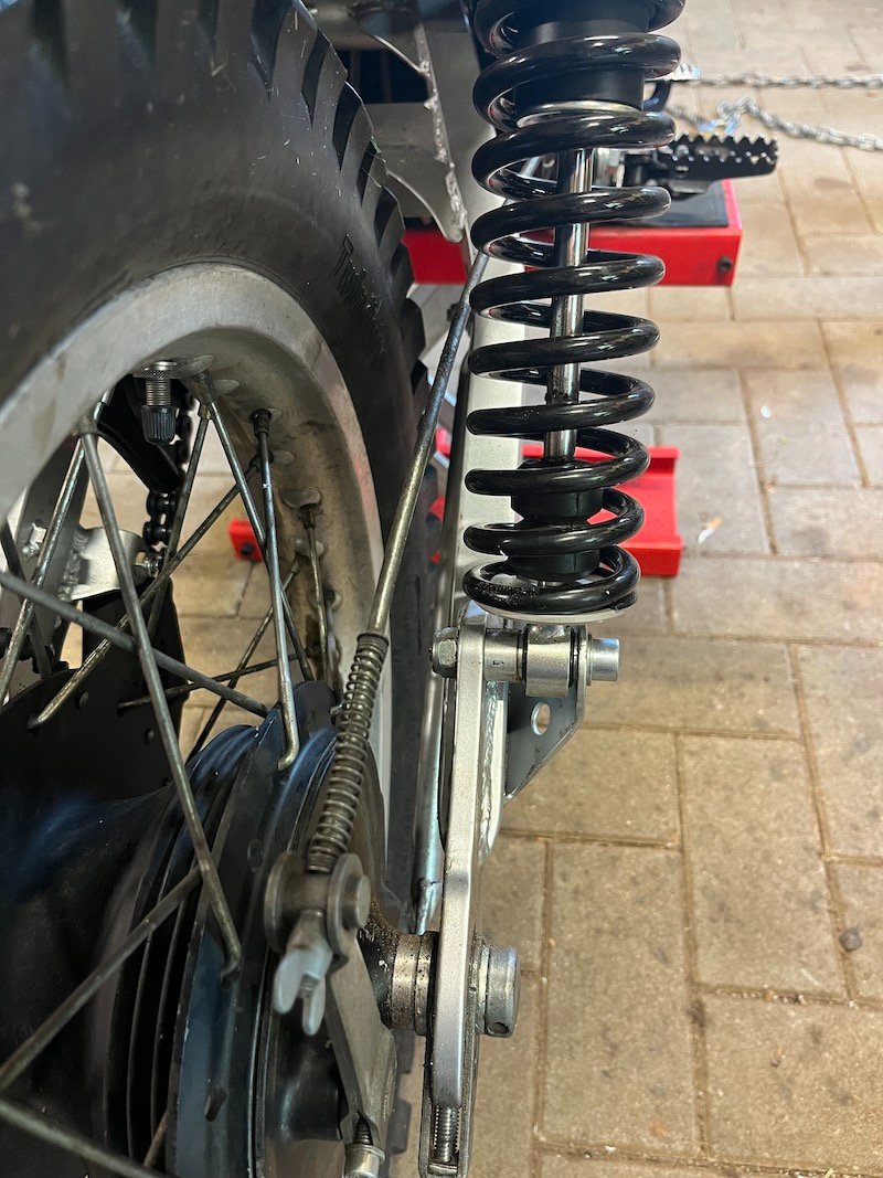 Hinten ist eine DR 500 Schwinge drin. Der Umbau übersteigt meine Fähigkeiten, das hat Meinold Müller gemacht. Wer das Weserbergland nicht kennt: geniale Motorradgegend, dann bei Meinold eine Pause machen und die Schätze in seinem Laden bestaunen, da kommt man ins träumen ...