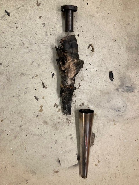 Also, Miles hat an den originalen Einsatz ein verlängertes Siebrohr angeschweisst. Dieses hat ein wenig größere Löcher als das originale Siebrohr. Um das so verlängerte Siebrohr ist Dämmwolle angebracht, die aber in einer Art Textil oder ähnlichem eingepackt ist. Das ganze Paket hat er dann in den Auspuff geschoben und das Siebrohr vorne krümmerseitig (in meinem Fall an mehreren Stellen) an die Innenwand des Töpfe geschweißt.