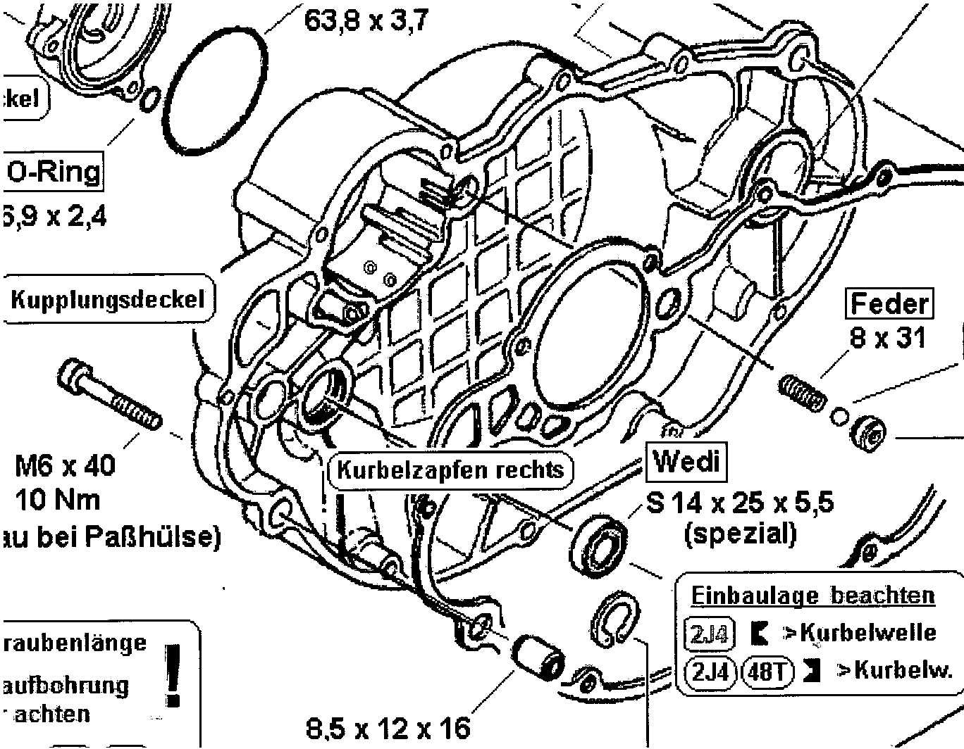 A. welchen Dichtring oder Wedi meinst du ? in meinen Unterlagen finde ich nur den Wedi zum Zündversteller -Teil Nr 4, ich finde aber keine Grösse in meinen Unterlagen.oder ein zerstörter Dichtring im Kupplungsdeckel zur Kurbelwelle
