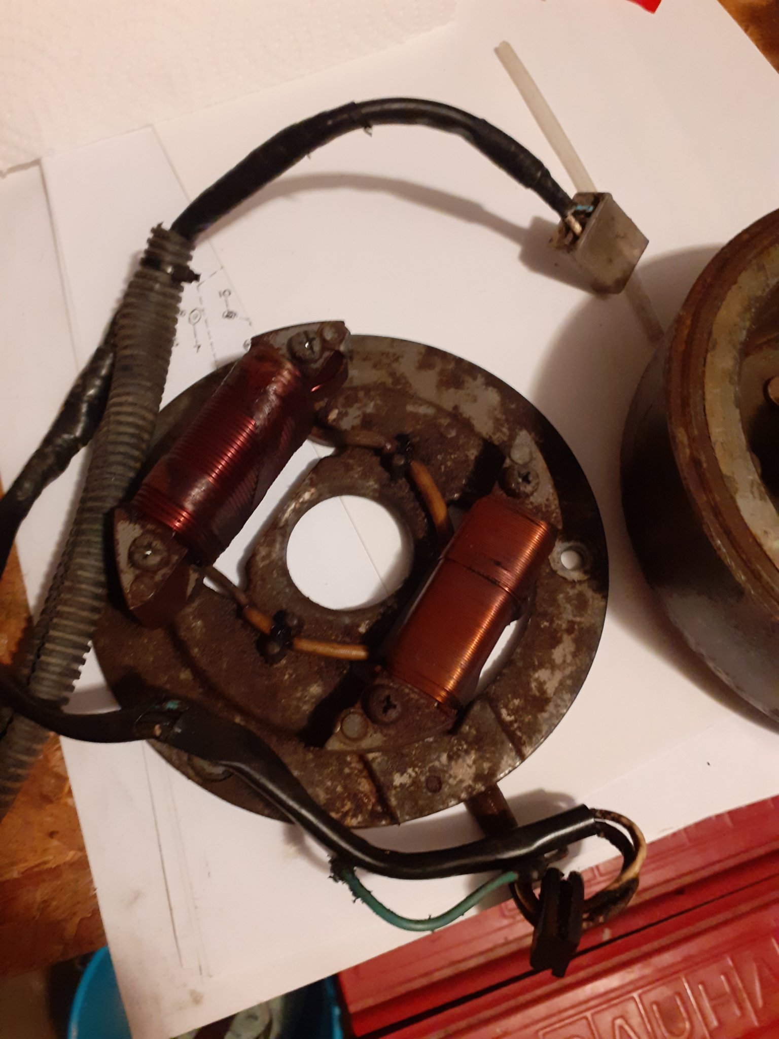 also das alte Zündschloß ist noch vorhanden kann es mal ausprobieren . Die Zündspule ist von Hitachi soweit ich mich erinnere. So warum habe ich die alte Lichtmaschine getauscht ? als ich den Seitendeckel der Lichtmaschine geöffnet habe kam mir erst mal ein halben Liter Wasser entgegen nach dem säubert und wieder Einbau hörte man wie die Spulen am Magneten schleifen verändern kann man den abstand nicht. Hier mal ein Bild würdet Ihr so eine Lichtmaschine im Motor lassen ?