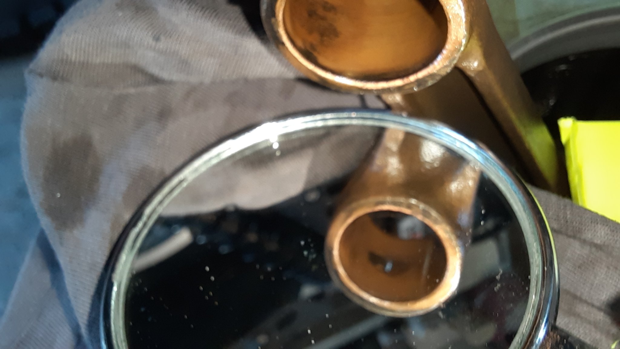 hier mal das Pleuelauge von unten. Die Kupferschicht ist gleichmässig, der alte Kolbenbolzen hat noch einbaumaß ( mit Mikrometer gemessen )