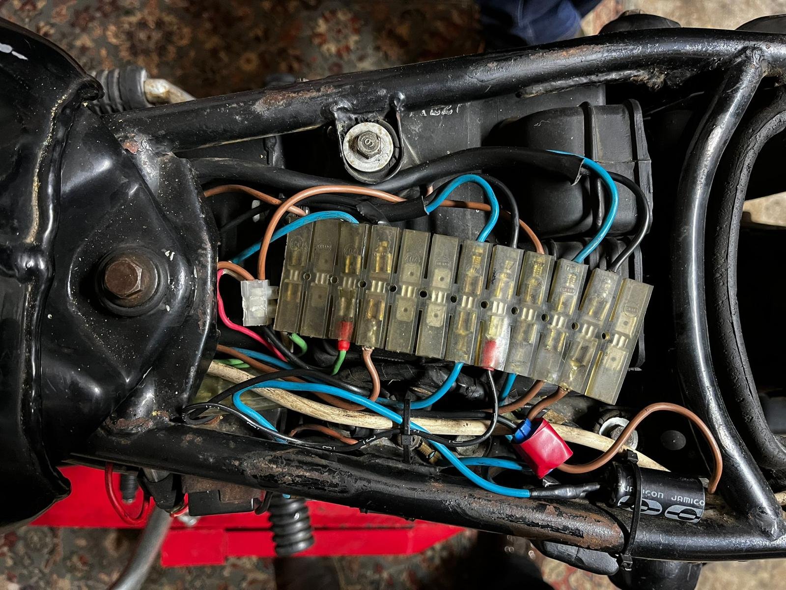 Bis auf die Elektrik, welche mit Lüster-, Wagoklemmen u.ä. "optimiert" wurde (TRIGGERWARNUNG), war die XT mechanisch in Ordnung.