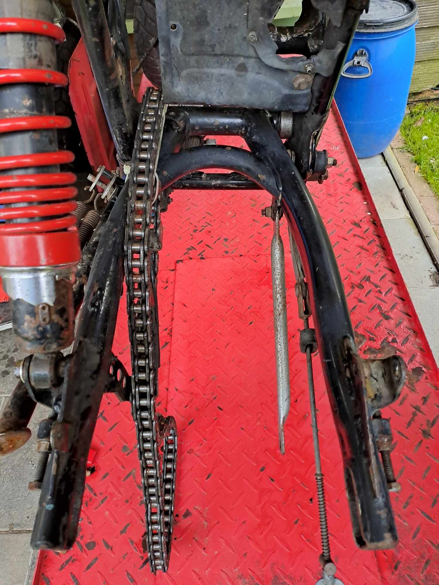 Was mir etwas Kopfzerbrechen macht, ist die verbaute Schwinge, welche nicht original zu seien scheint. Passen tut alles, aber ich finde das Gute Stück nicht im Netz. Leider habe ich keine Originale da, aber im Vergleich zu Bildern scheint sie etwas länger zu sein (51 cm Gesamtlänge)
