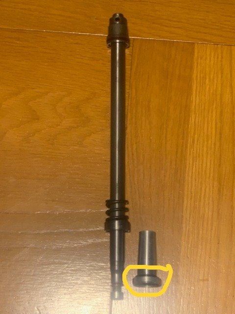 Von unten wird der nebenliegende Konus auf die Dämpferstange aufgeschoben, dieser kann wiederum nur bis zum Sprengring nach oben rutschen und sitzt nach erfolgter Montage quasi mit dem gelb markierten Ventil am Boden des Gleit-/Tauchrohres. Da kann die "ominöse Hülse" nicht noch darunter sitzen, dann wäre die Schraube zur Verbindung von Stand und Tauchrohr viel zu kurz.