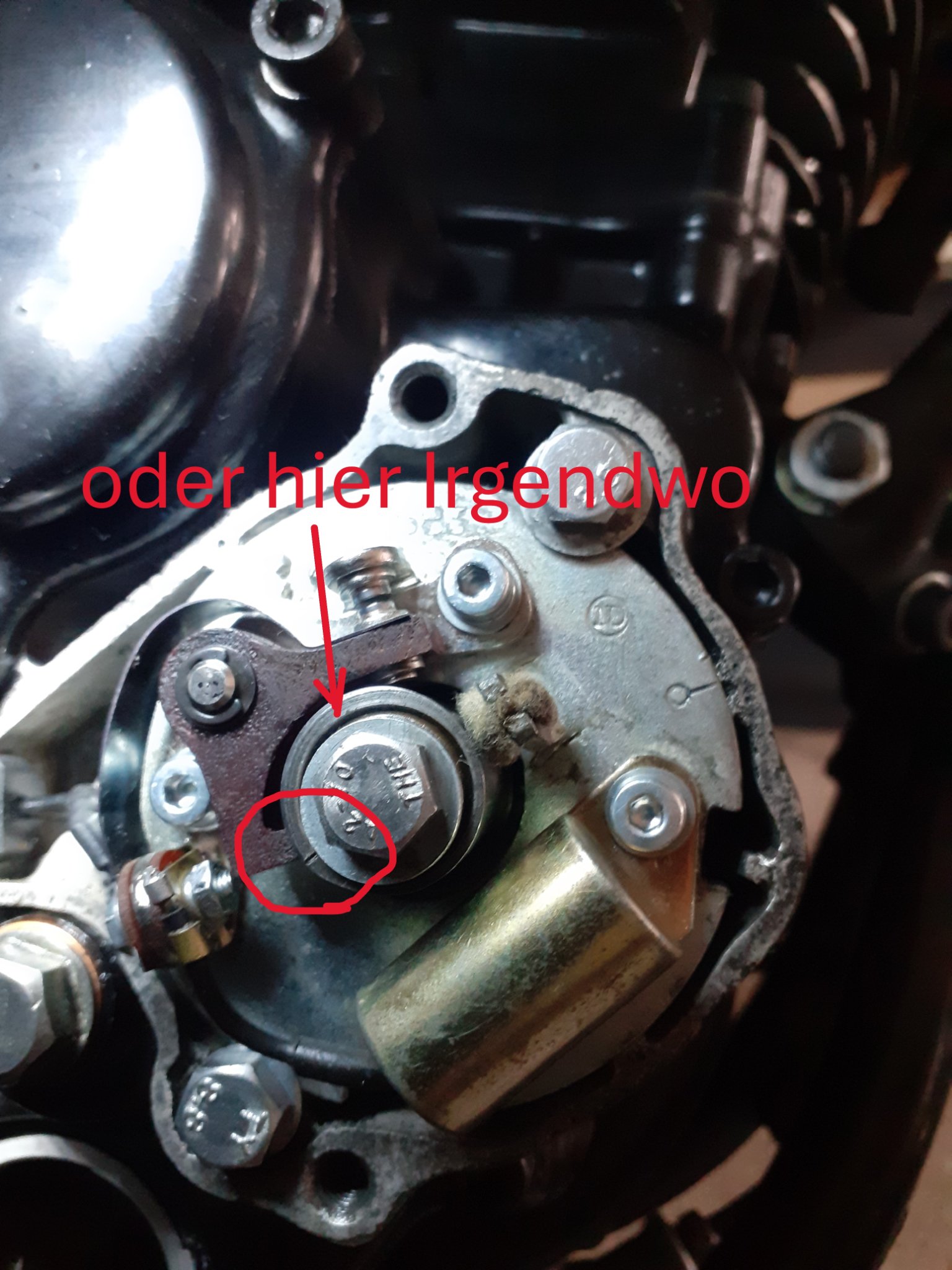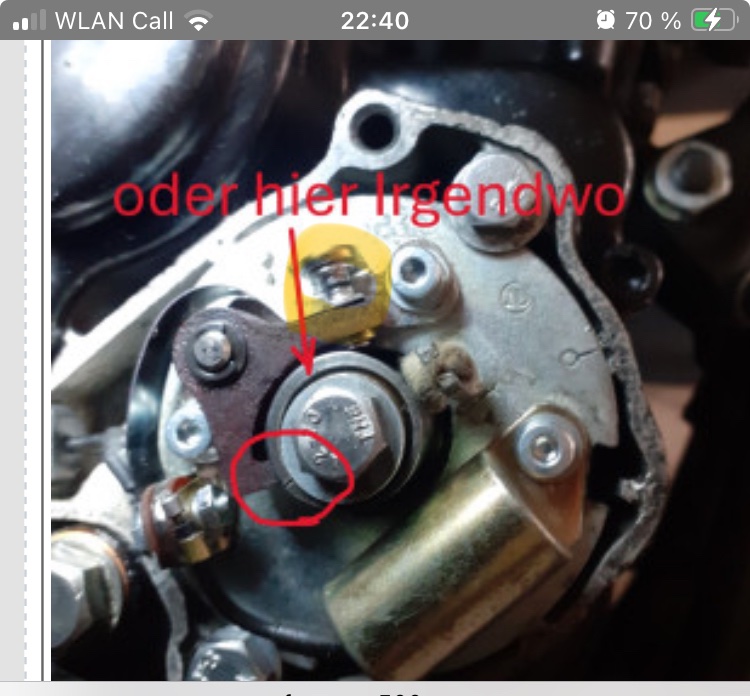 Was alteisentreiner meint ist man stellt den Abstand der Unterbrecherkontakte auf 0.35 ein wenn der Nocken so gestellt ist das der Kontakt die maximale Öffnung hat. Also den Abstand der Kontakte im gelben Kreis Kreis , danach dann den Zündzeitpunkt auch nochmal einstellen