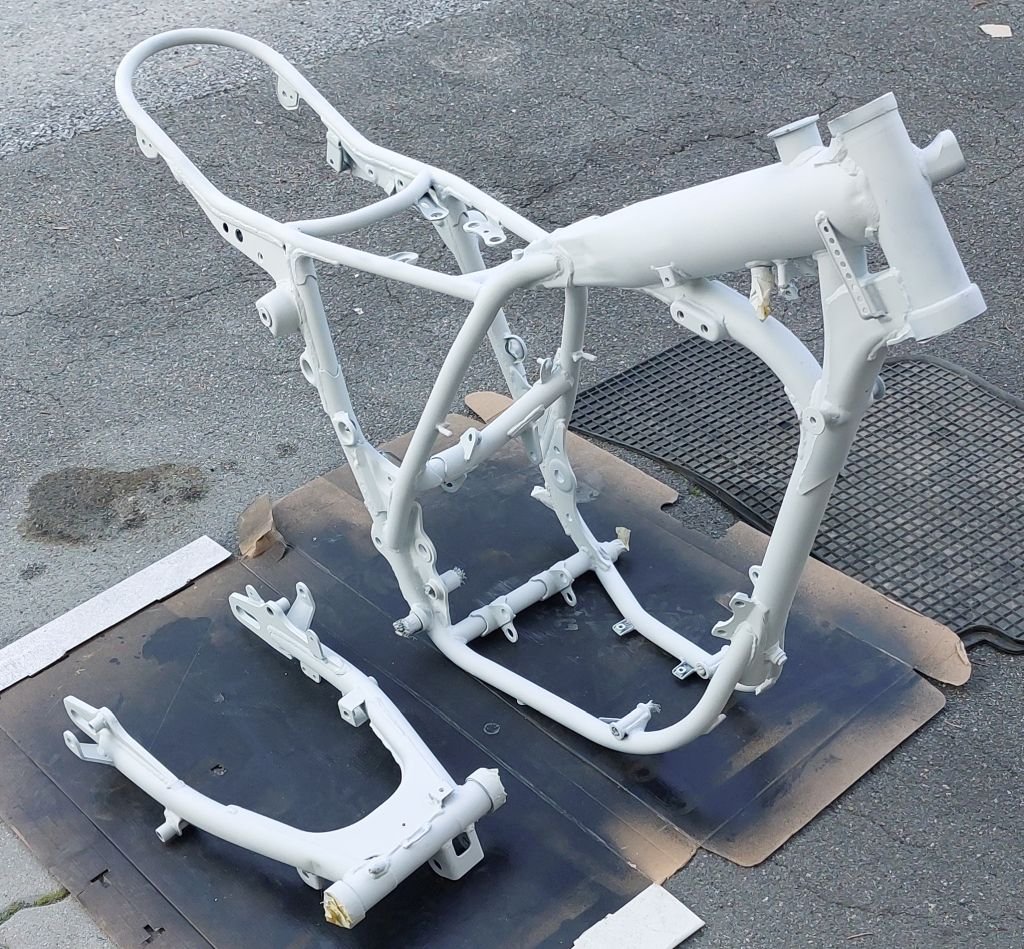- Der Rahmen und die Schwinge der XT77 wurden wieder vom Lack befreit und neu grundiert. Sie sind bereit zum Lackieren.