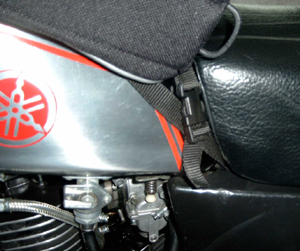 Normalerweise wird der Rucksack passend zum Tankverschluss auf den Tank gelegt und vorn einmal unter dem Lenkkopf und hinten durch das Rahmendreieck festgezurrt. Die anderen beiden Riemen könnten auch zum Sichern von hoch auftürmender Ladung auf dem Rucksack sein (wenn denn Ösen am Rucksack vorhanden sind).
